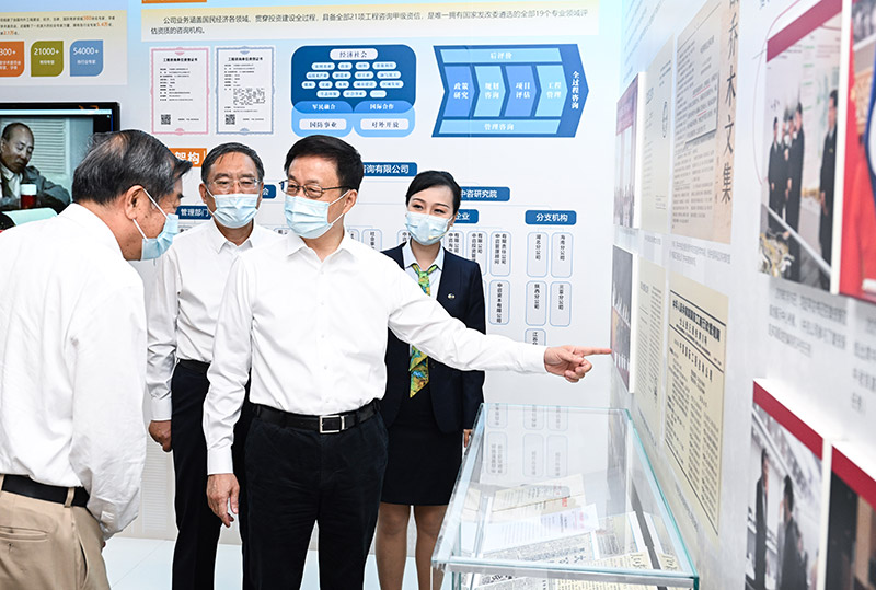 会前,韩正前往展厅,听取中国国际工程咨询有限公司的发展历程介绍,了解公司承担基础设施、重大工程等重点领域咨询任务以及高端智库建设等情况。