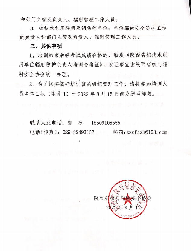 1、培训结束后经考试成绩合格的,颁发《陕西省核技术利用单位辐射防护负责人培训合格证》,发证事宜由陕西省核与辐射安全协会统一办理。