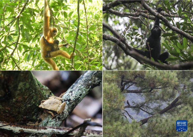 拼版照片:左上图为2021年5月拍摄的海南长臂猿B群幼猿(海南热带雨林国家公园管理局供图);右上图为在海南热带雨林国家公园体制试点区霸王岭自然保护区内拍摄的海南长臂猿(2019年10月25日新华社记者蒲晓旭摄);左下图为在霸王岭自然保护区内拍摄的姬蛙(2019年10月26日新华社记者蒲晓旭摄);右下图为在霸王岭自然保护区内拍摄的蛇雕(2019年10月26日新华社记者蒲晓旭摄)。 新华社发