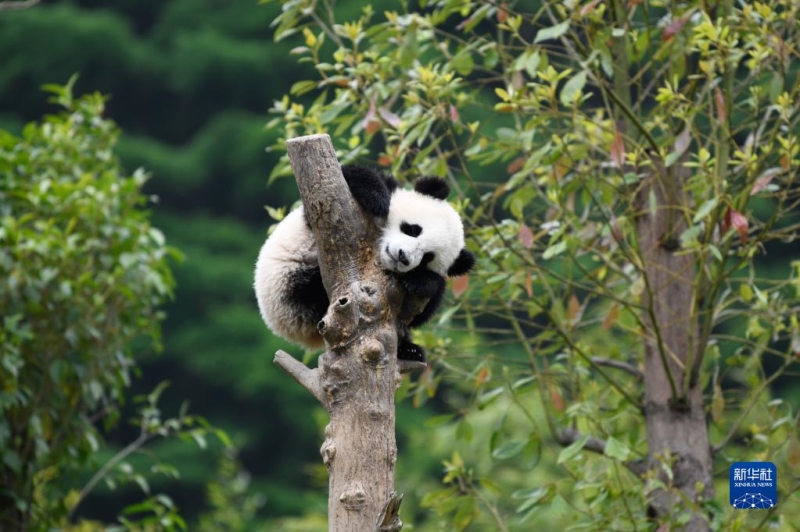 在中国大熊猫保护研究中心卧龙神树坪基地内,一只大熊猫在树上休息(2022年4月24日摄)。 新华社记者 胥冰洁 摄