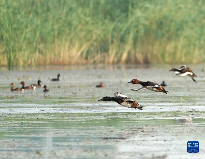 夏日的白洋淀,碧波荡漾,荷红苇绿。辽阔的水面上,一群活泼可爱的青头潜鸭幼鸟跟随“父母”在芦苇丛中穿梭。这意味着,世界极度濒危物种青头潜鸭将白洋淀作为了繁殖地。