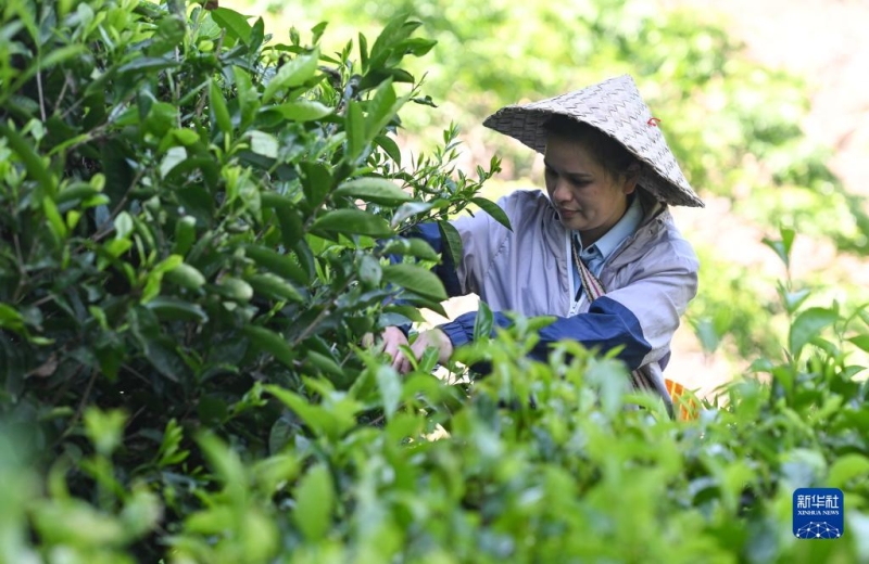 海南省五指山市水满乡毛纳村茶农在茶园采茶(2022年4月10日摄)。 新华社记者 杨冠宇 摄