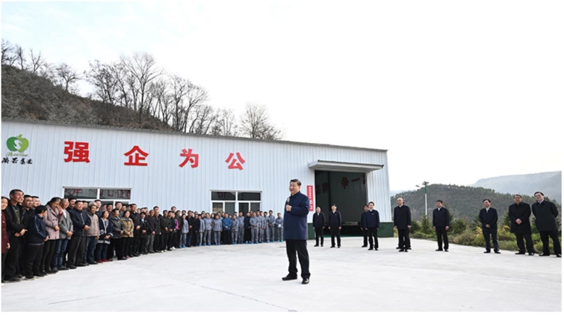 车间外,老乡们聚集在一起,高声向总书记问好。习近平同老乡们拉起家常,回忆当年他在陕北的知青岁月。习近平对老乡们说,我在陕北生活了7年,当年看到老乡们生活很艰苦,心里就想着怎么样让大家生活好起来。这次来延安,看到一派硕果累累的丰收景象,交通条件大为改善,发生了翻天覆地的变化。过去陕北老乡们修梯田、种庄稼,面朝黄土背朝天,抡起老锄头干活,广种薄收,十分辛苦,如今山坡上退耕还林种上了苹果,老乡们有工作、有稳定收入,孩子有好的教育,老人都有医保,生活越来越好。从陕北的变化就可以看到中国的变化。习近平指出,现在,“两个一百年”奋斗目标的第一个百年目标已经实现,绝对贫困问题解决了,老乡们过上了好日子,但还要继续努力往前走,让生活越来越美好。陕北的气候、光照、纬度、海拔等非常适宜发展苹果种植,加上滴灌技术、矮化种植技术、选果生产线等不断发展,就地卖出,销路不愁,大力发展苹果种植业可谓天时地利人和,这是最好的、最合适的产业,大有前途。习近平强调,中国共产党是人民的党,是为人民服务的党,共产党当家就是要为老百姓办事,把老百姓的事情办好。空谈误国,实干兴邦。要认真学习贯彻党的二十大精神,全面推进乡村振兴,把富民政策一项一项落实好,加快推进农业农村现代化,让老乡们生活越来越红火。老乡们爆发出雷鸣般的掌声。