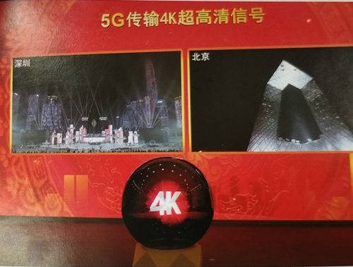 2019年2月4日的春节联欢晚会上,中国电信、中国移动、中国联通三家运营商将春晚深圳分会场的盛况,通过5G 4K超高清直播和5G VR直播的形式实时回传到央视总台,实现了央视春晚首次VR和4K超高清视频内容的5G传输。