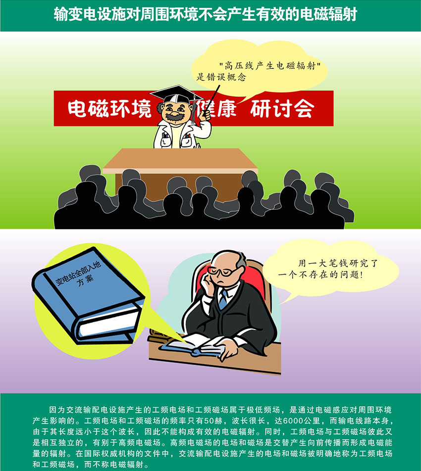我国输变电设备的频率为50赫兹(通常为工频),和广播电视、通信、微博的频率10*5-10*9赫兹相比,频率低得多,所以它很不容易产生辐射。国际“电磁兼容”标准中规定,9000赫兹以上的频率才称谓“射频”,也就是说9000赫兹以下频率的电源因辐射量太小,可以认为他们基本不会发射电磁波,50赫兹工频比9000赫兹还小180倍,它的辐射功率就更小,对人身不会产生任何影响。